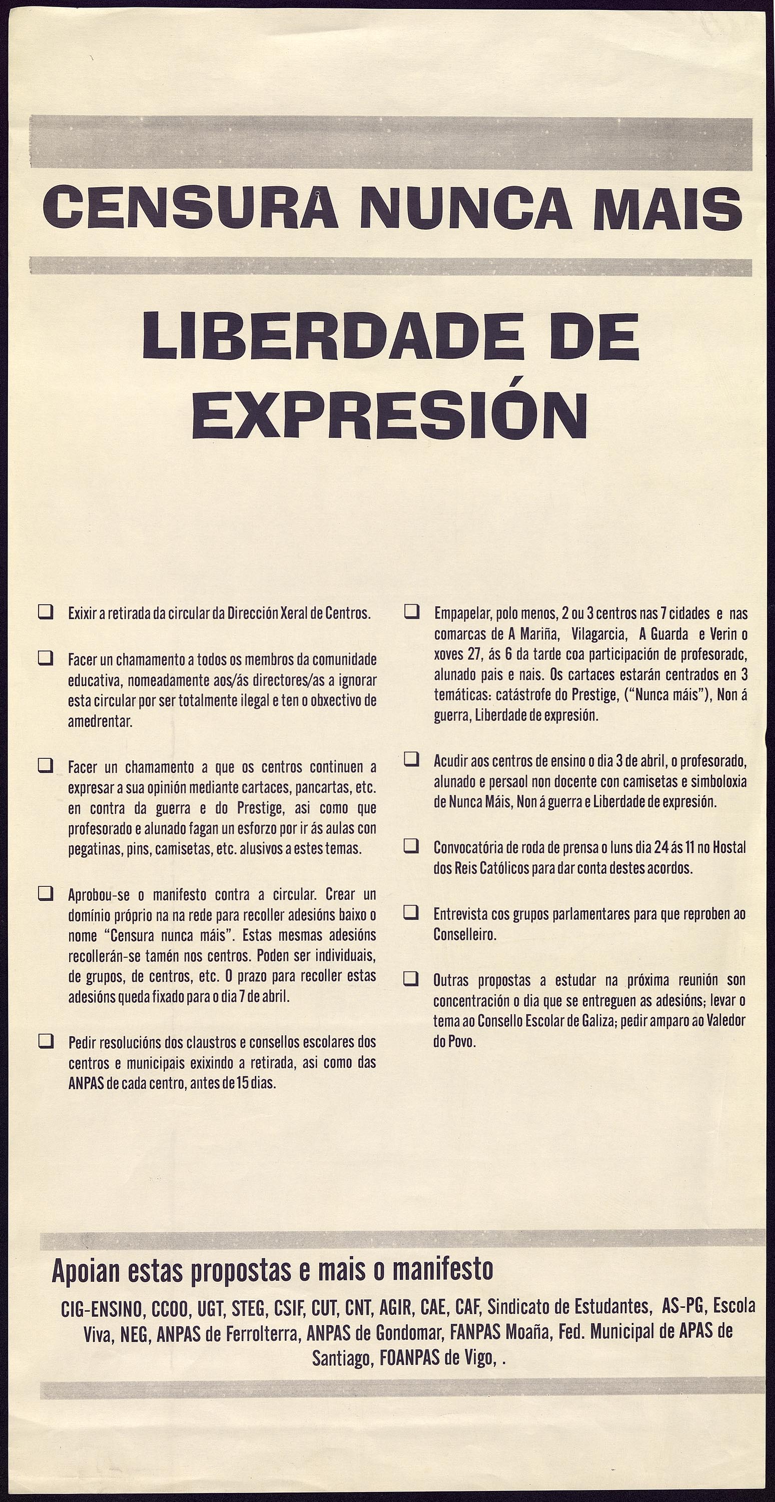 Manifesto asinado por sindicatos, organizacións estudantís e ANPAs como resposta á circular da Xunta prohibindo as reivindicacións sobre o Prestige e a guerra de Iraq na primavera de 2003. A dita circular titulábase "Instrucións sobre publicidade e propaganda nos centros educativos e outras cuestións formuladas en relación co seu funcionamento e réxime xurídico" e a súa intención era actuar "ante a proliferación da existencia de publicidade e propaganda nos taboleiros de anuncios" dos centros. O manifesto esixía a retirada da circular e animaba os centros a "continuar expresando a súa opinión" sobre a guerra e o Prestige.