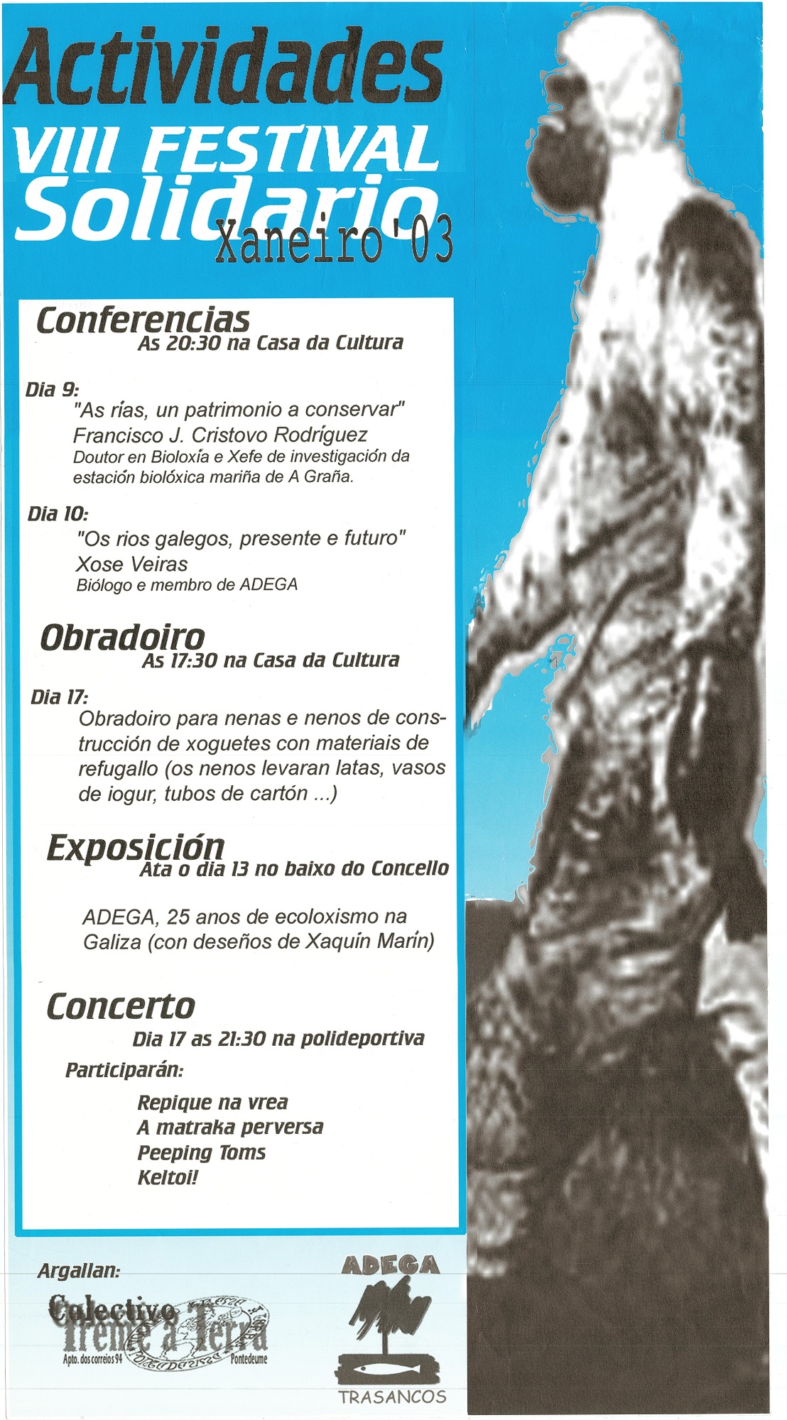 VIII Festival solidario, Xaneiro'03 [Material gráfico]: actividades : argallan, Colectivo Treme a Terra, Adega