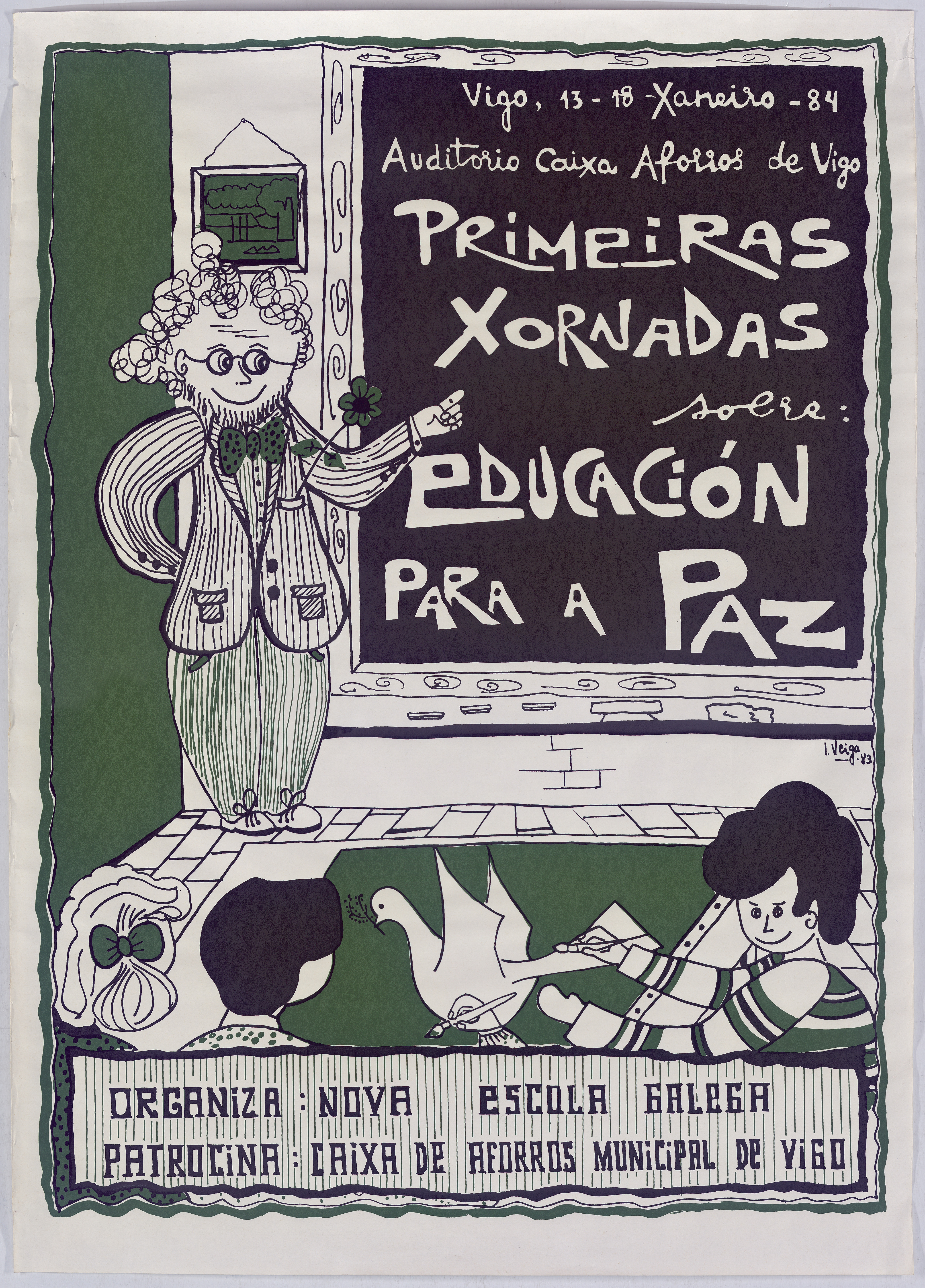 Cartel das primeiras xornadas sobre educación para a paz, celebradas no auditorio da Caixa de Aforros de Vigo en 1984, organizadas por Nova Escola Galega e patrocinadas pola Caixa de Aforros Municipal de Vigo