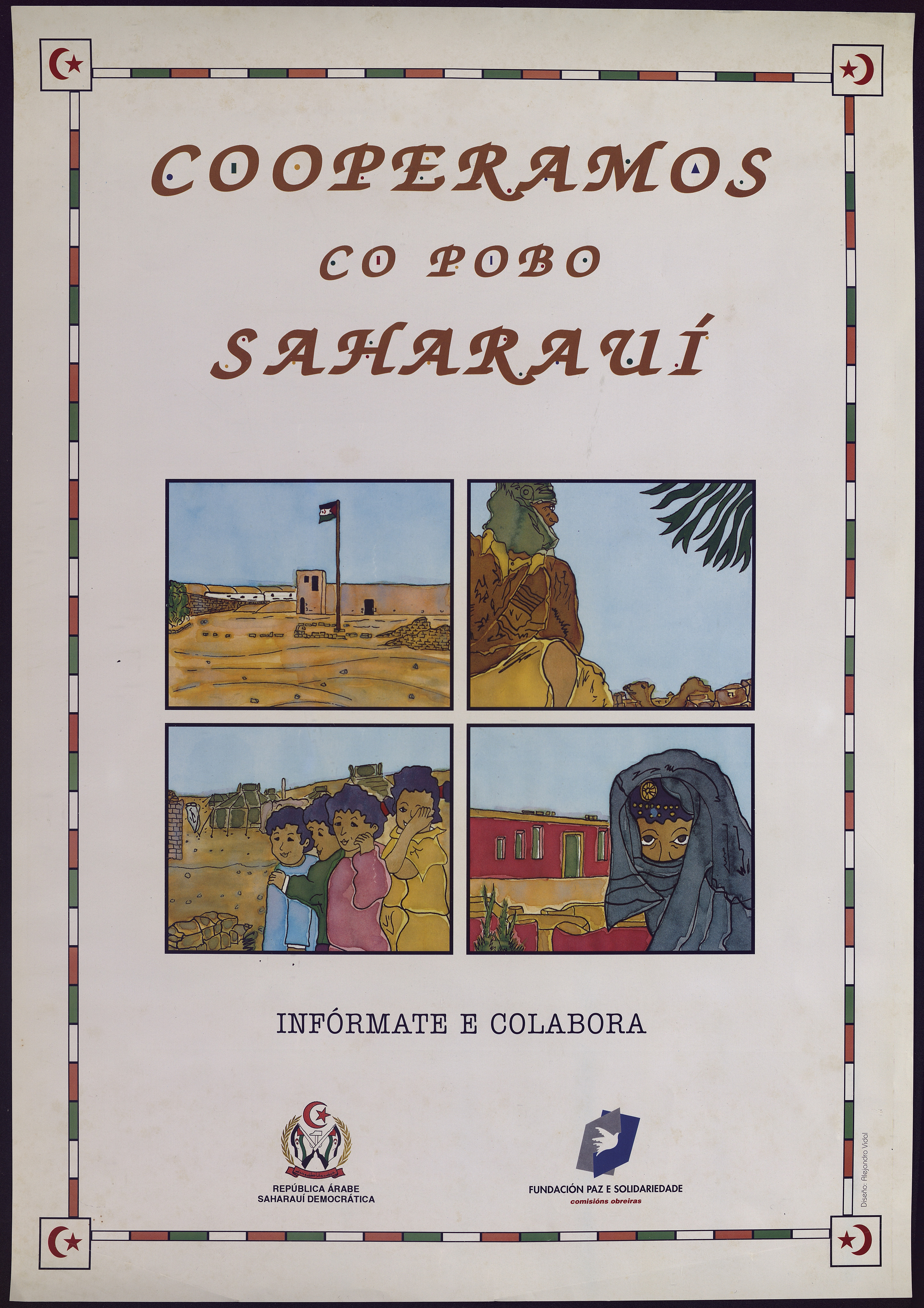 Cartel de cooperación co Pobo Saharauí en colaboración coa Fundación Paz e Solidariedade (Comisións Obreiras) e a República Árabe Saharauí Democrática. Deseño de Alejandro Vidal