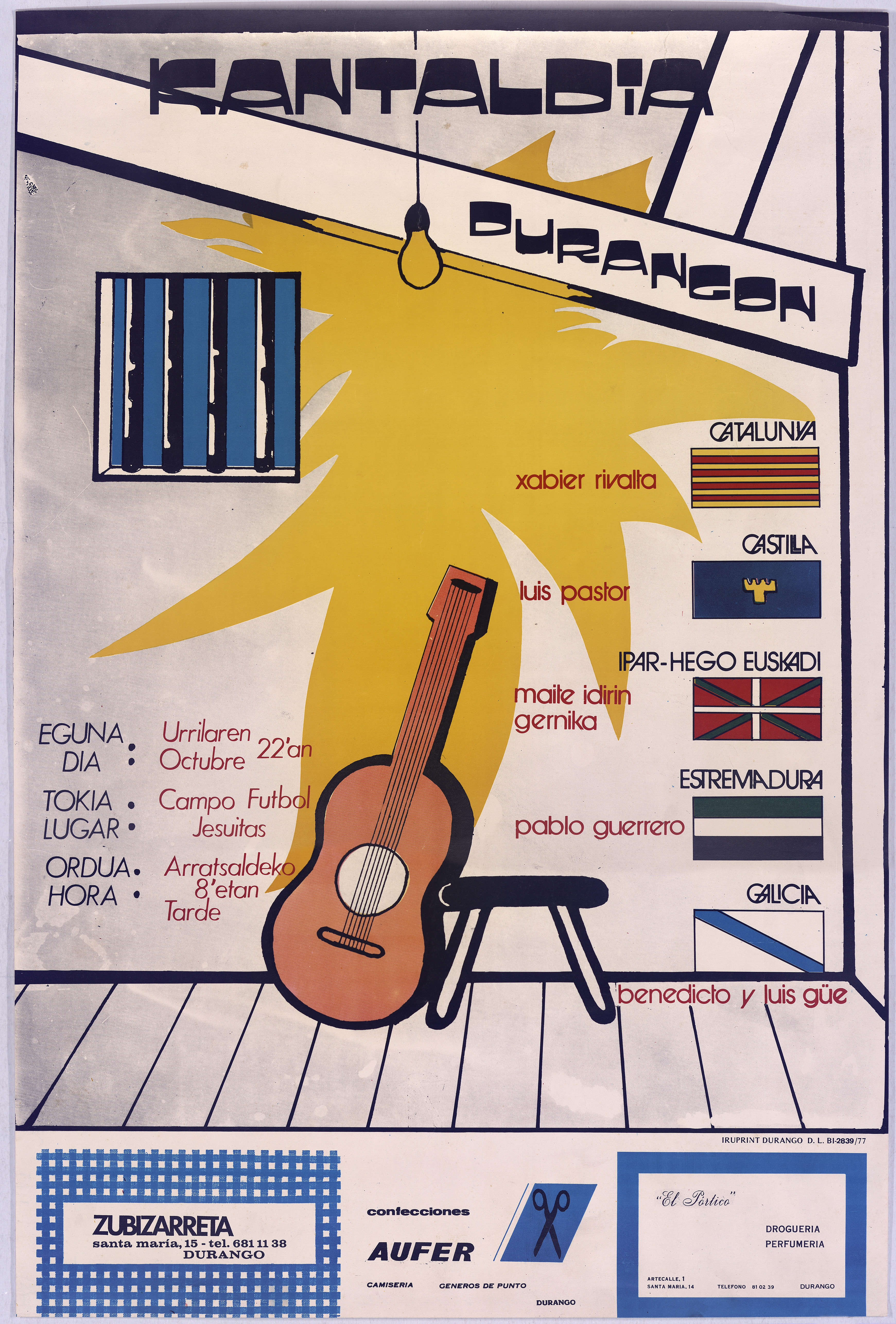Cartel dun concerto celebrado en Durango o 22 de outubro de 1977, que contou coa participación, entre outros artistas, de Benedicto e Luis Güe representando a Galicia