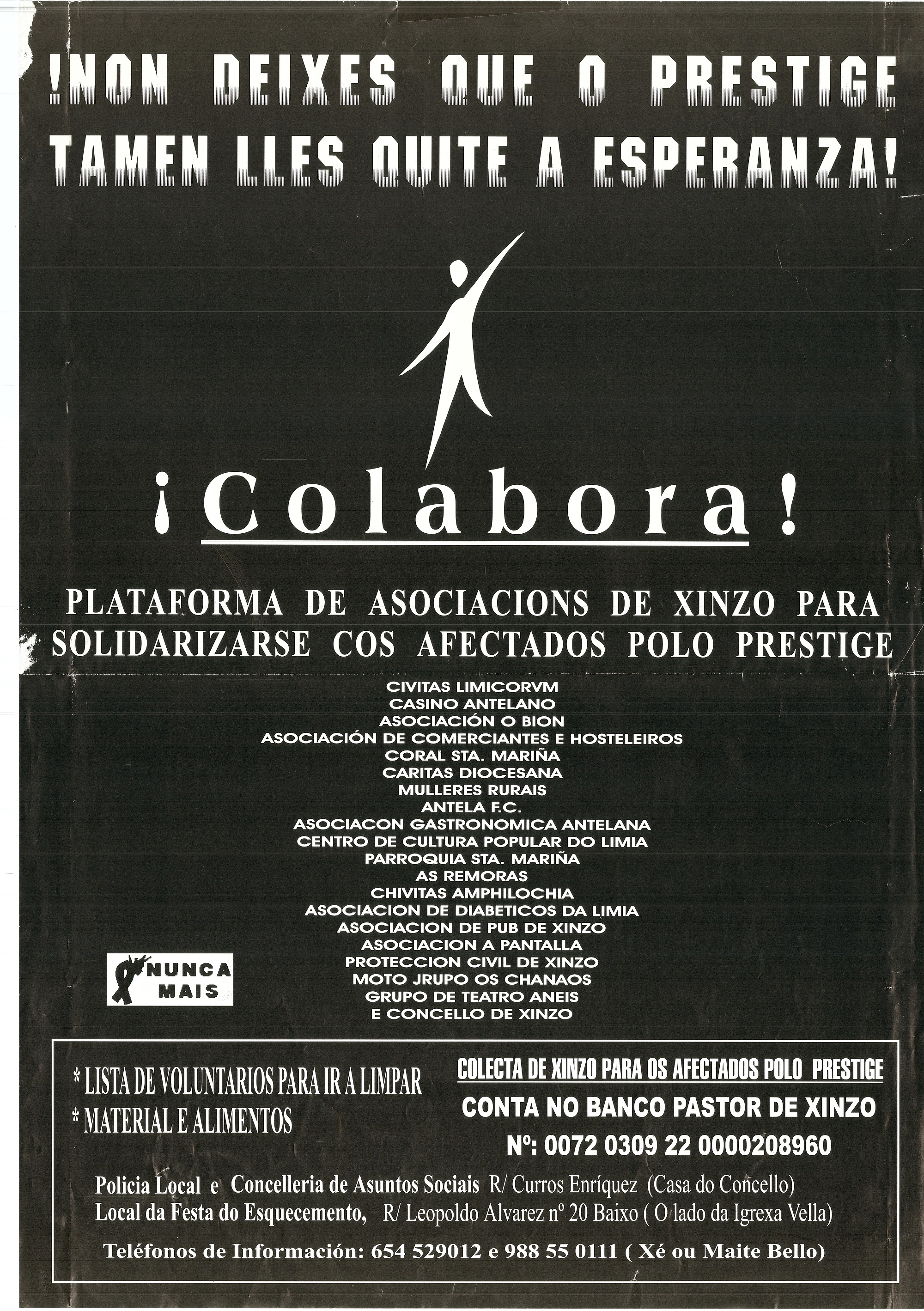 ¡Non deixes que o Prestige tamén lles quite a esperanza! [Material gráfico] : ¡Colabora! : Plataforma de Asociacións de Xinzo para solidarizarse cos afectados polo Prestige