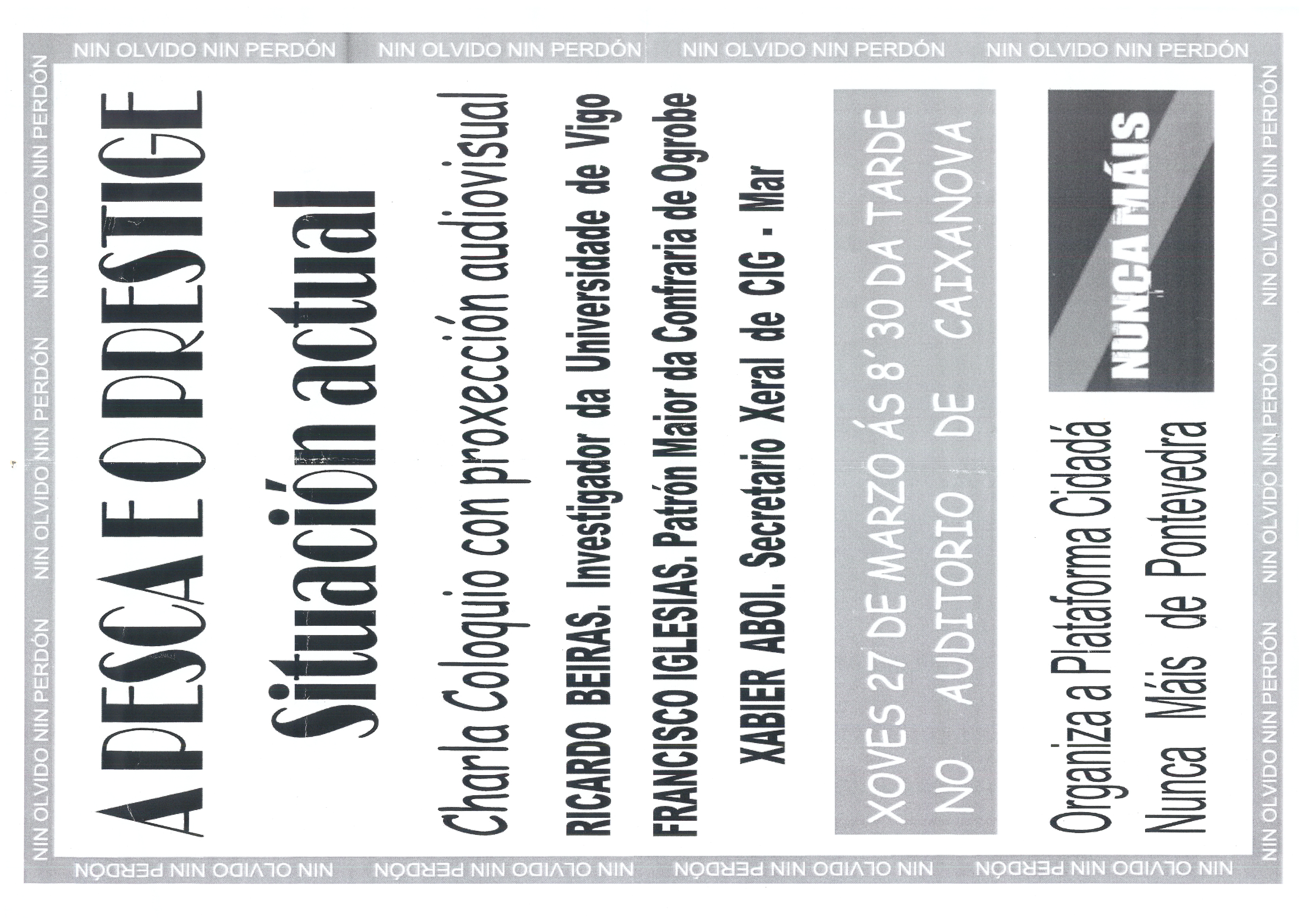 A pesca e o Prestige : situación actual : charla coloquio con proxección audiovisual : xoves 27 de marzo : organiza a Plataforma Cidadá Nunca Máis de Pontevedra : nin olvido nin perdón