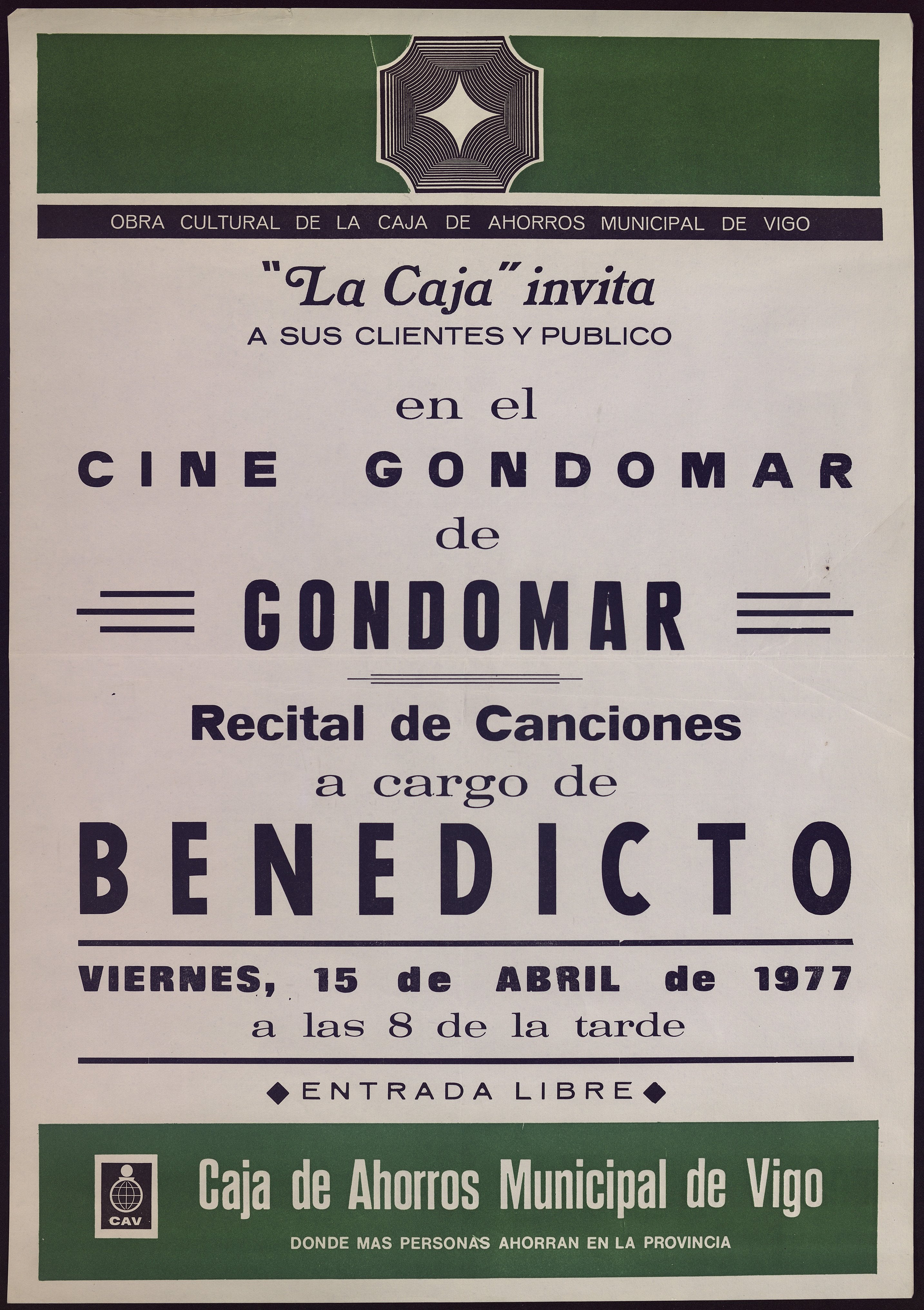 Recital de canciones a cargo de Benedicto: viernes, 15 de abril de 1977 a las 8 de la tarde