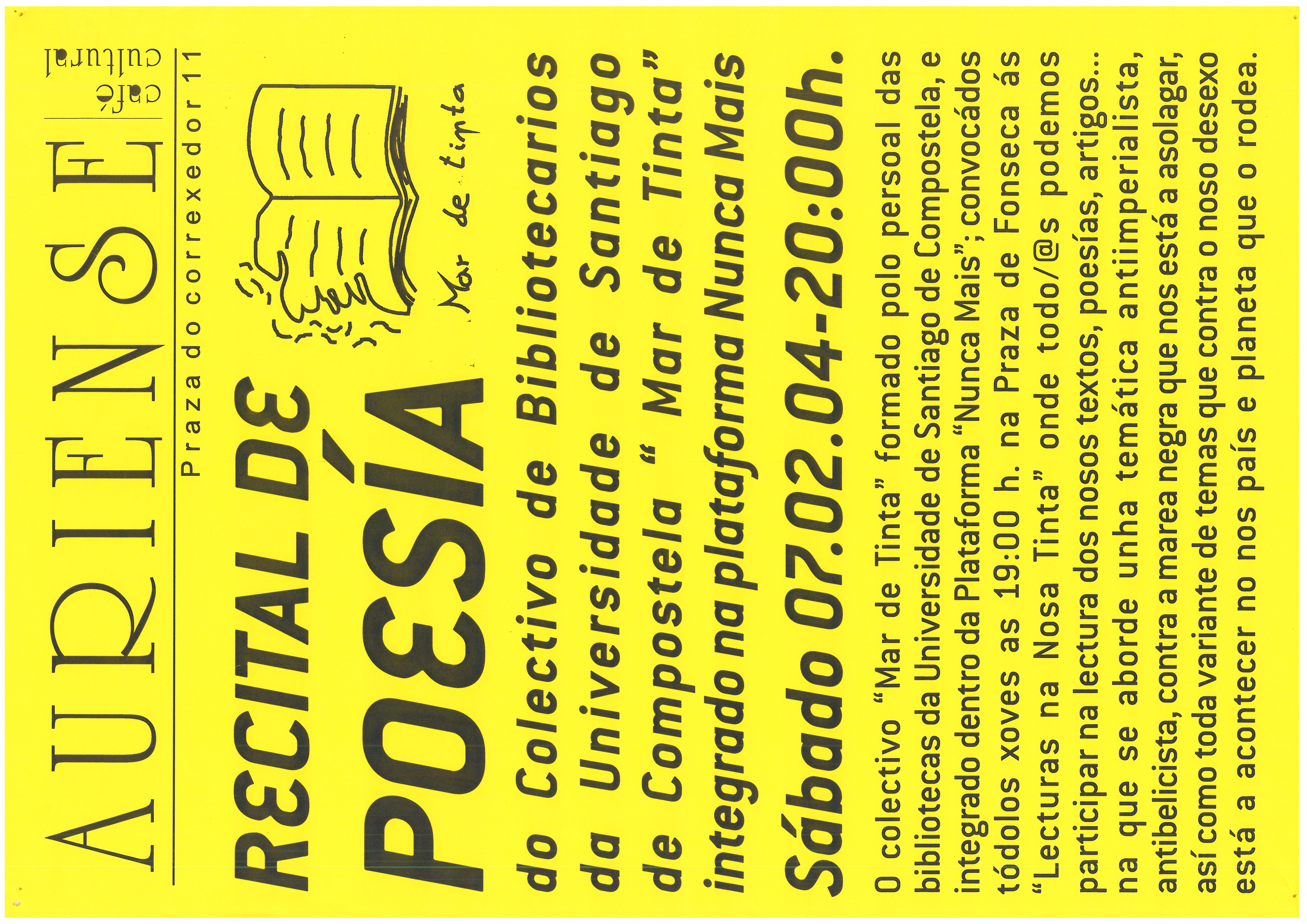 Recital de poesía do Colectivo de Bibliotecarios da Universidade de Santiago de Compostela "Mar de Tinta" integrado na plataforma Nunca Máis : Sábado 07.02.04 : Auriense Café Cultural