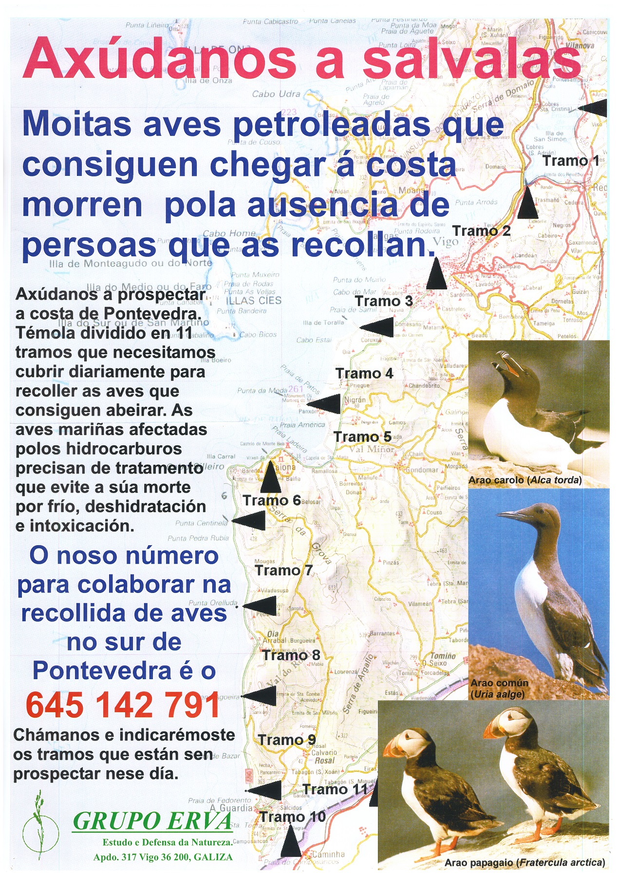 Axúdanos a salvalas [Material gráfico] : moitas aves petroleadas que consiguen chegar á costa morren pola ausencia de persoas que as recollan